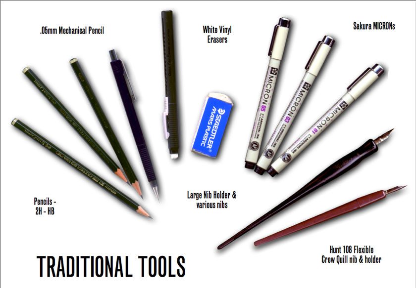 Pencils come and pencils go.  I used to favor a combination of H, HB & 2B lead.  I would use H for roughs and HB or softer for final pencils, but these days I just stick with HB. I use wooden pencils (Tombows are my favorite) for roughs, and then use mechanical pencils in three sizes for backgrounds the require rulers and other tighter detail work. For erasers, I vastly prefer a certain soft, white, smooth-texture that Pentel Clic and Staedtler Mars eraser provide.  They erase cleanly and effectly.  Recently, I’ve also re-discovered the classic kneaded eraser, which also erases very well, and can be sculpted to smaller shapes for more accurate eradication.