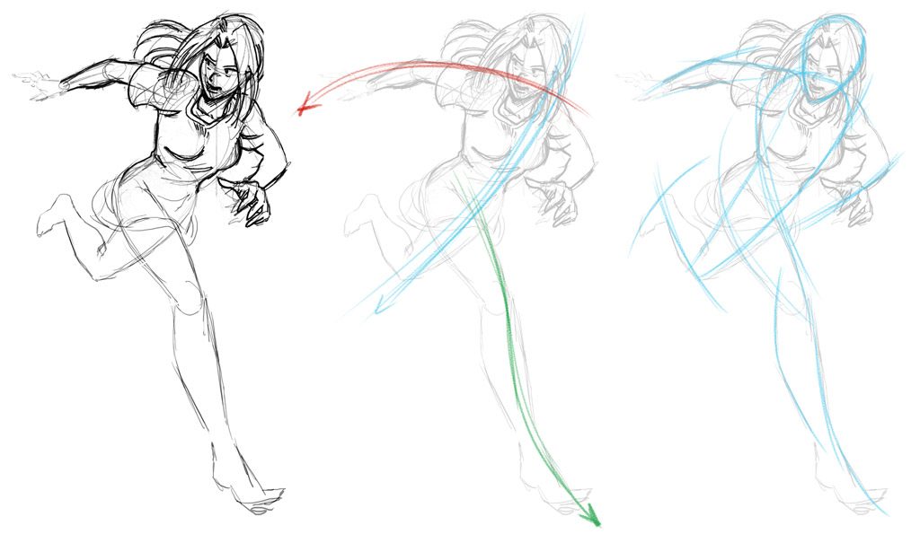 Okay, now that we have the basic shapes and proportions down, we need to be able to draw our characters in more than close-ups and standing around doing nothing. We need to put them into motion so they take on some life. To do that, we need to start with a fluid set of lines, or “gestures”. For the above drawing, I started with a rough drawing like this: